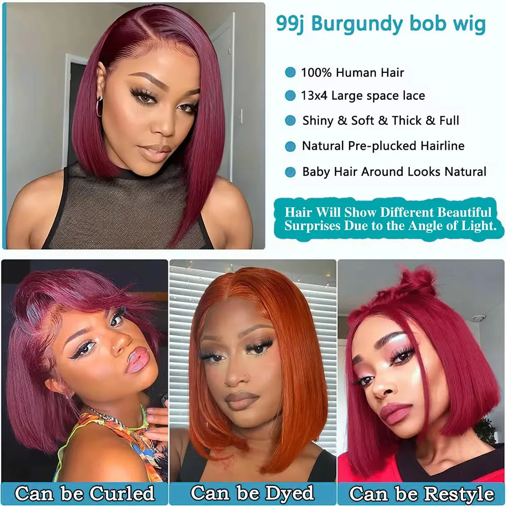 99J Burgundy Straight Short Bob Wig 13x4 Transparent Lace Frontal Wig 100% Brazilian Human Hair Wig 180 Density For Women